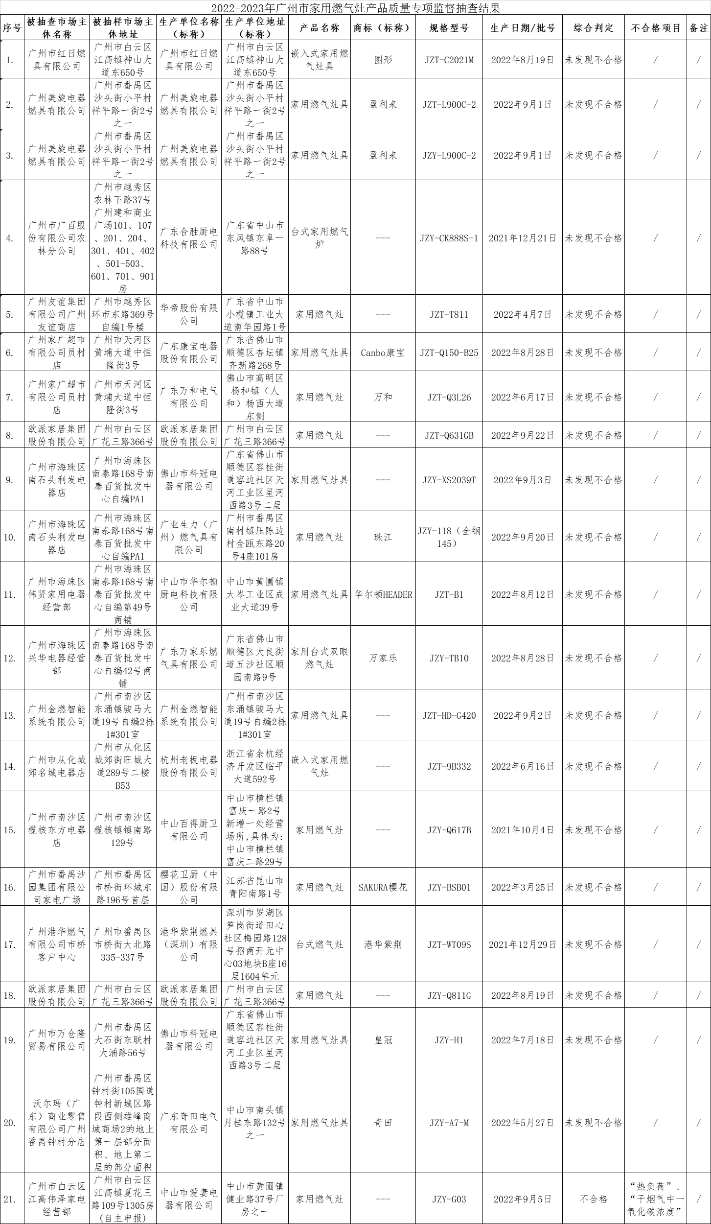 附件:2022-2023年广州市家用燃气灶产品质量专项监督抽查结果