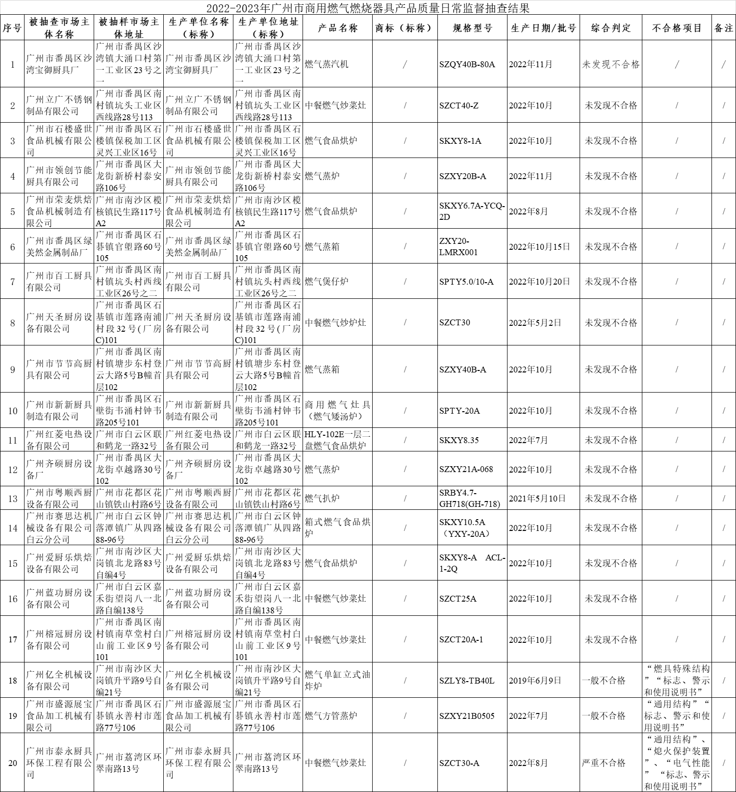 附件:2022-2023年广州市商用燃气燃烧器具产品质量日常监督抽查结果