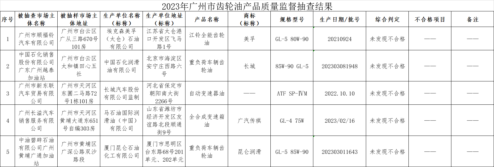 附件:2023年第三季度广州市齿轮油产品质量监督抽查结果