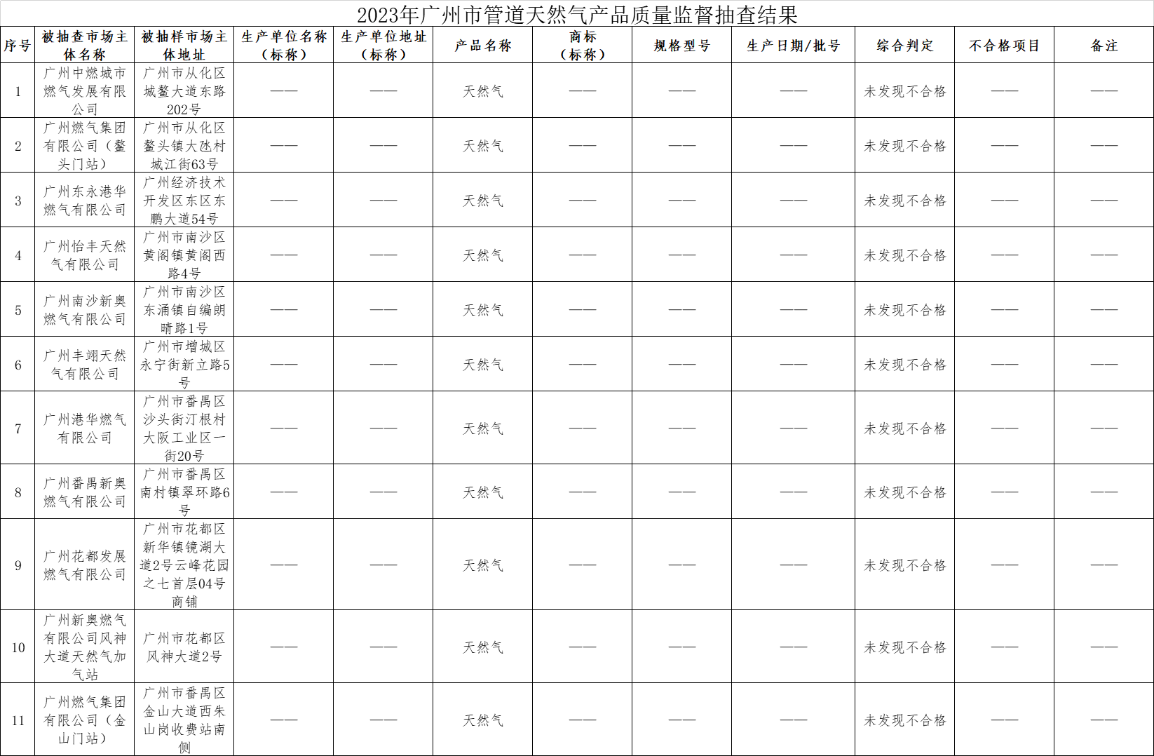 2023年第三季度,广州市市场监督管理局对天然气产品质量进行了监督抽查,共抽查了11批次样品,经检验,全部产品符合标准要求。