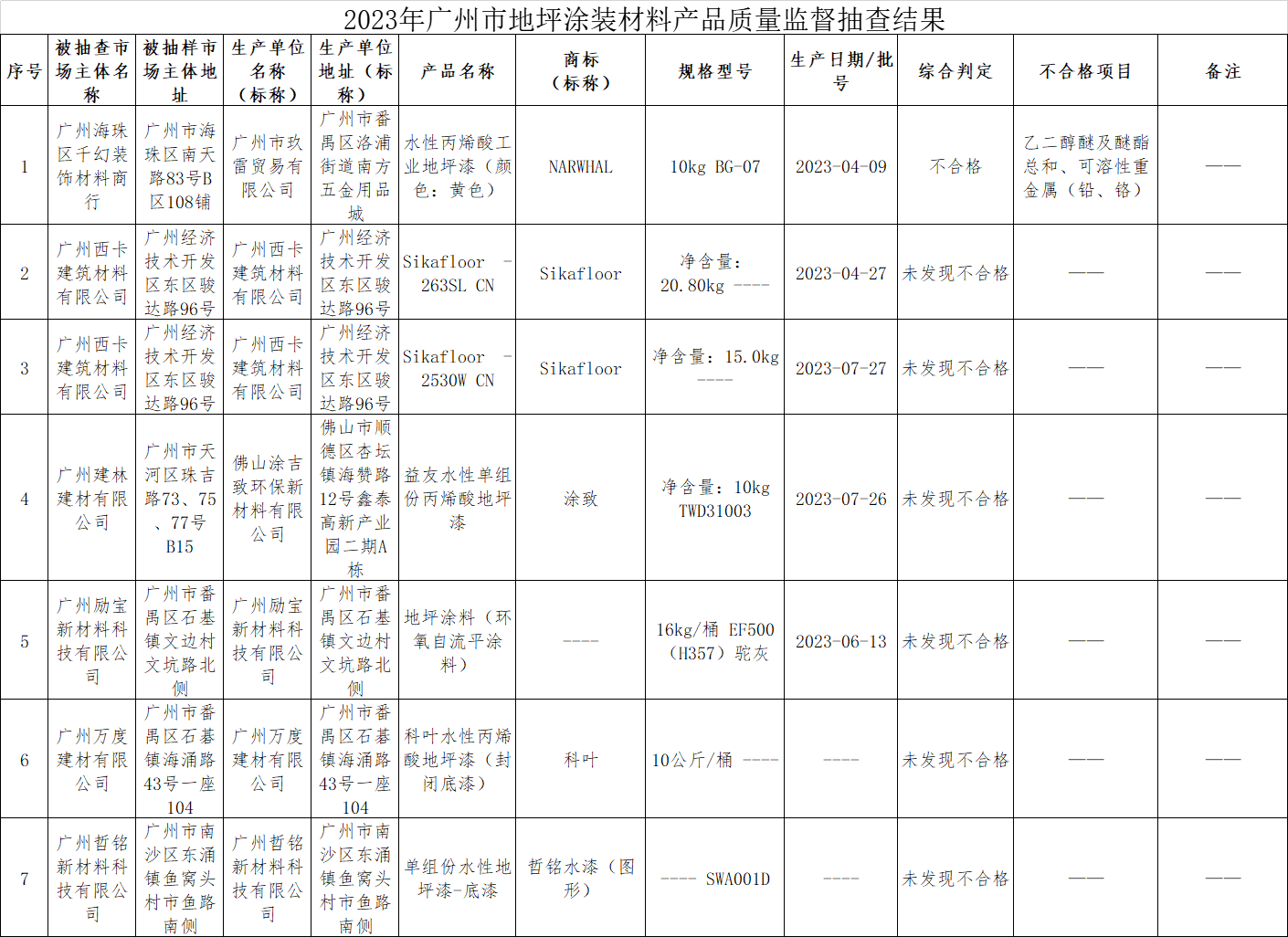 2023年第3季度,广州市市场监督管理局对地坪涂装材料产品质量进行了监督抽查,共抽查了7批次样品,经检验,有1批次产品不符合标准要求。