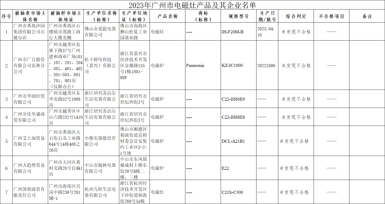 2023年第3季度,广州市市场监督管理局对电磁灶产品质量进行了监督抽查,共抽查了7批次样品,经检验,本次监督抽查未发现不合格。