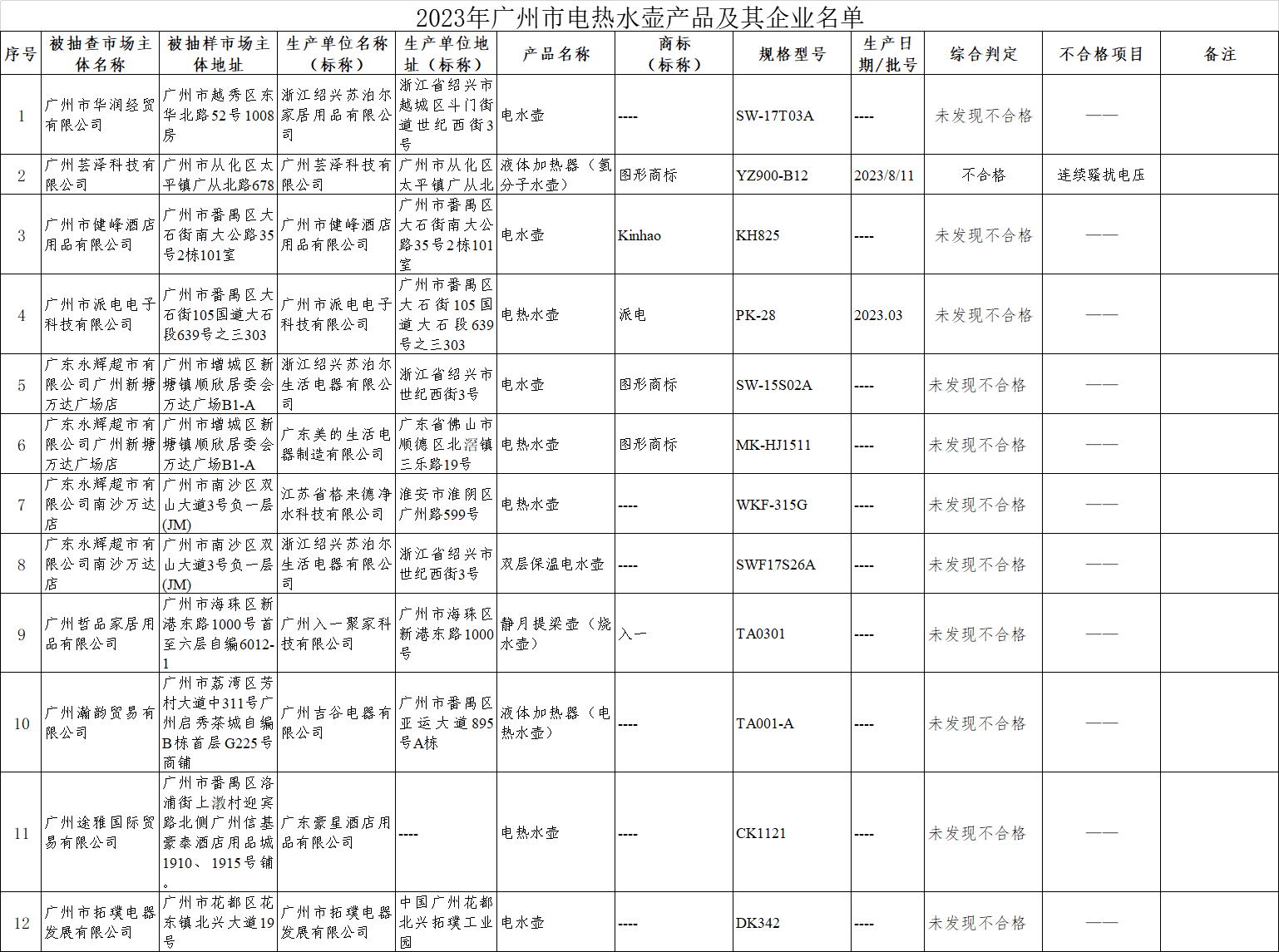 2023年第3季度,广州市市场监督管理局对电热水壶产品质量进行了监督抽查,共抽查了12批次样品,经检验,有1批次产品不符合标准要求。