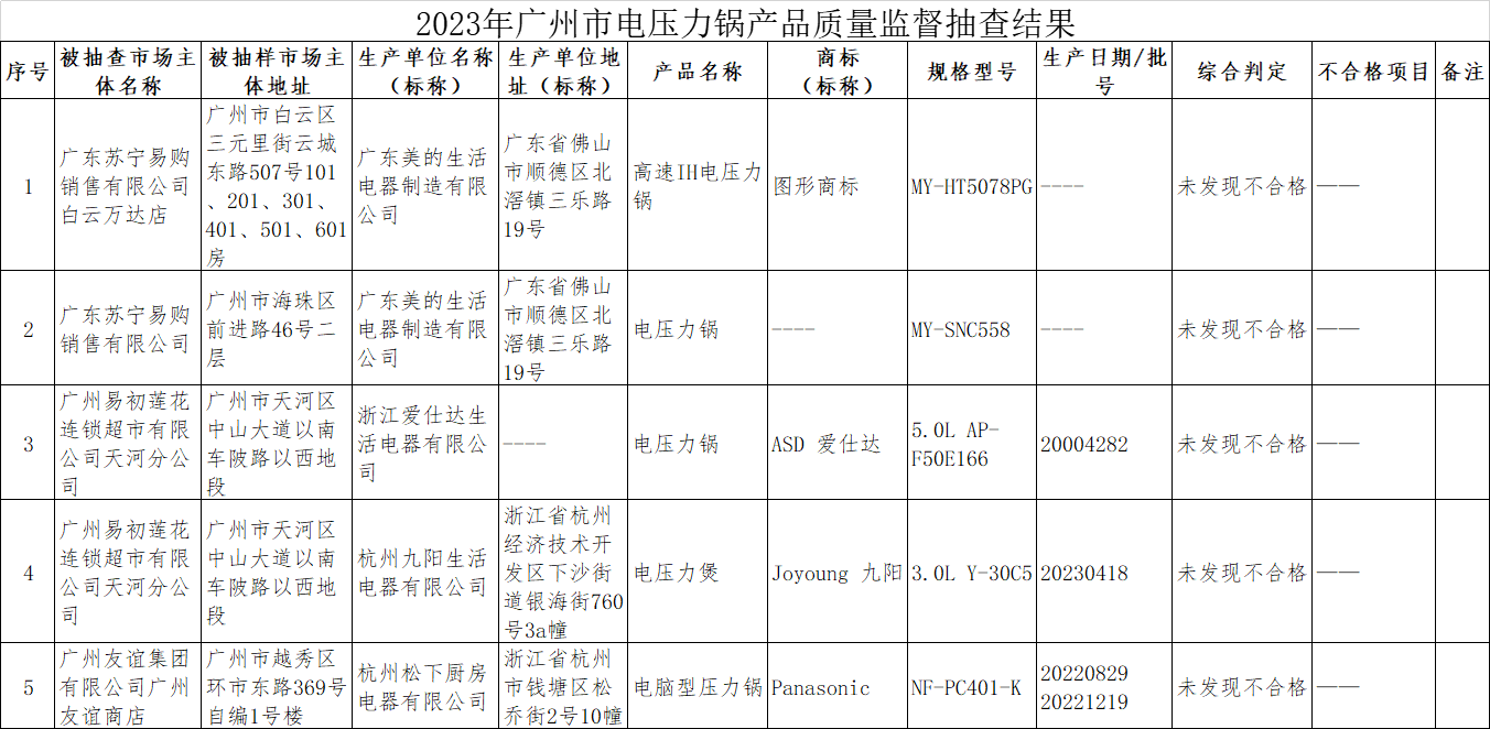 2023年第三季度,广州市市场监督管理局对电压力锅产品质量进行了监督抽查,共抽查了5批次样品,经检验,未发现不合格。