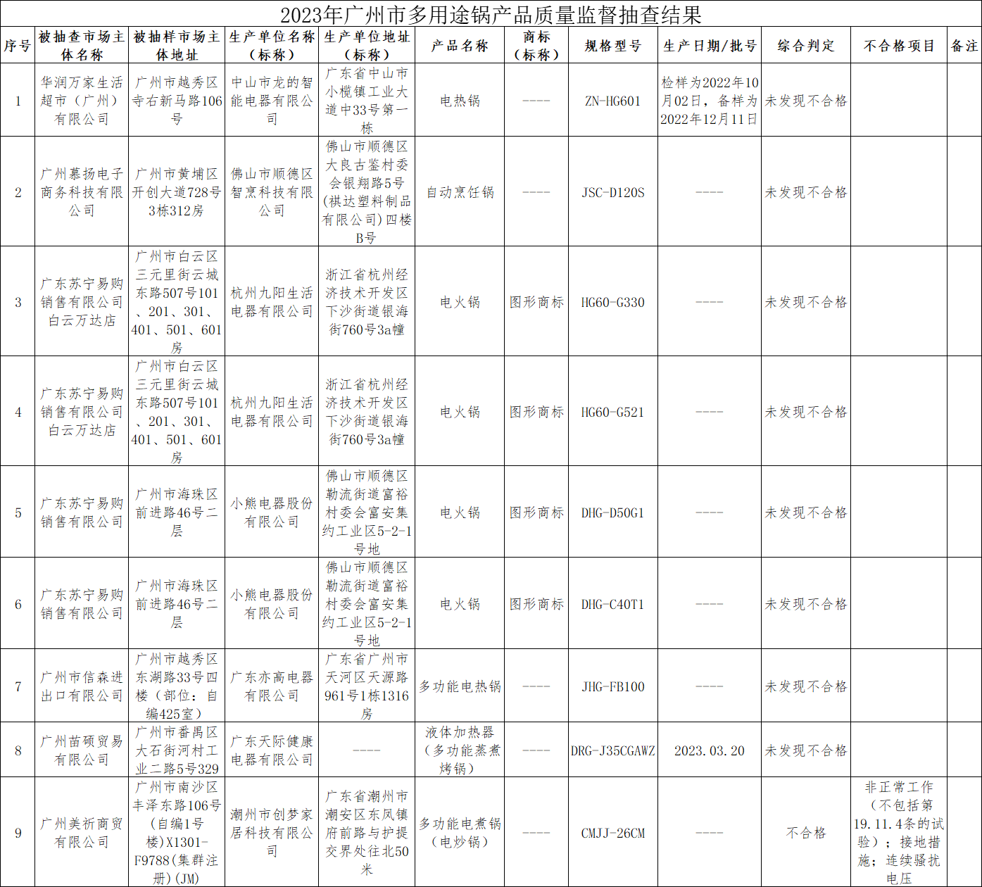 2023年第三季度,广州市市场监督管理局对多用途锅产品质量进行了监督抽查,共抽查了9批次样品,经检验,有1批次产品不符合标准要求。