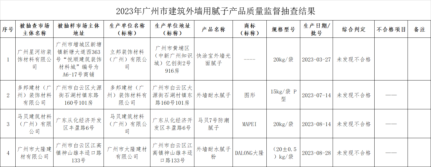 2023年第三季度,广州市市场监督管理局对建筑外墙用腻子产品质量进行了监督抽查,共抽查了4批次样品,经检验,产品符合标准要求。