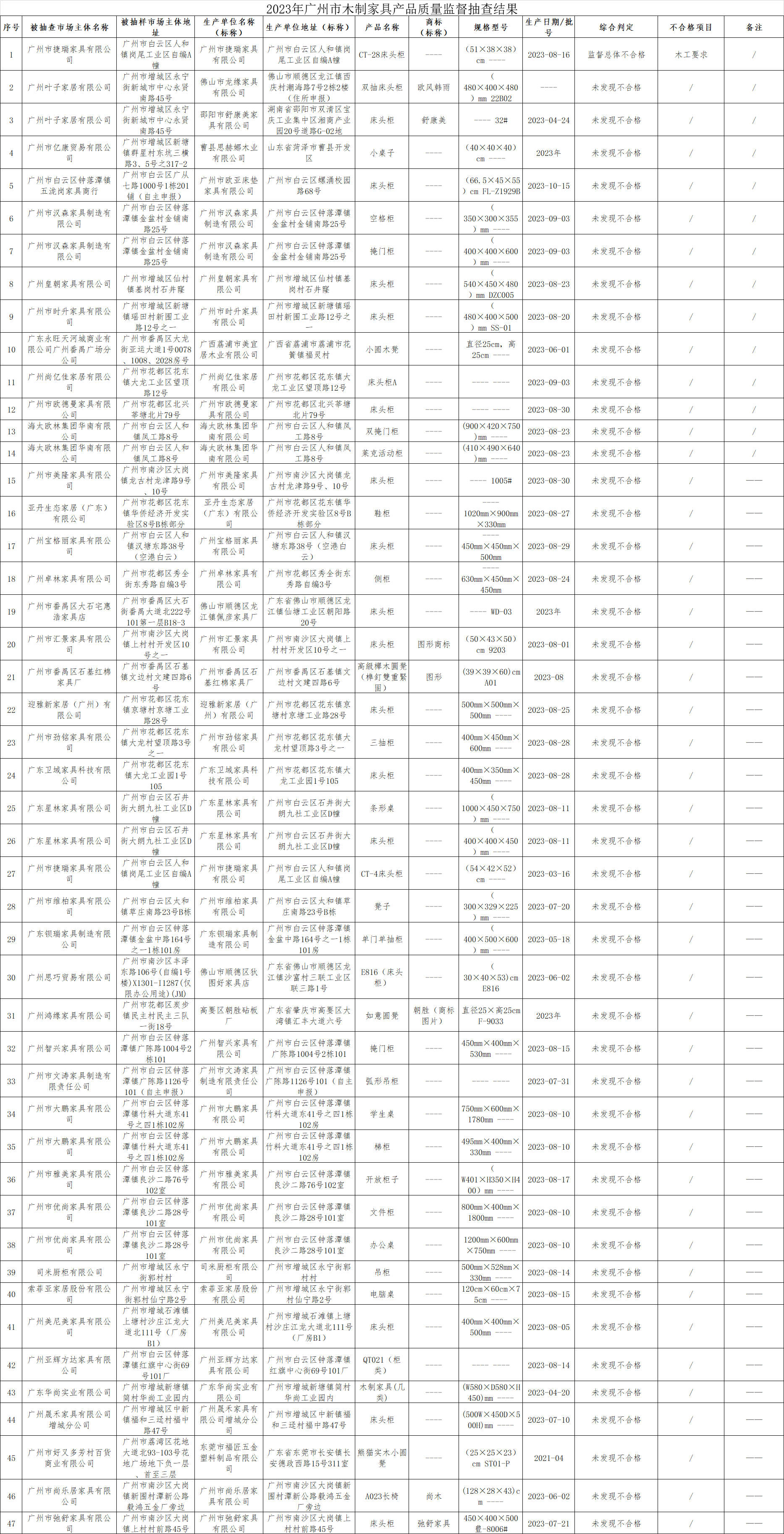2023年第三季度,广州市市场监督管理局对木制家具产品质量进行了监督抽查,共抽查了47批次样品,经检验,有1个批次产品不符合标准要求。