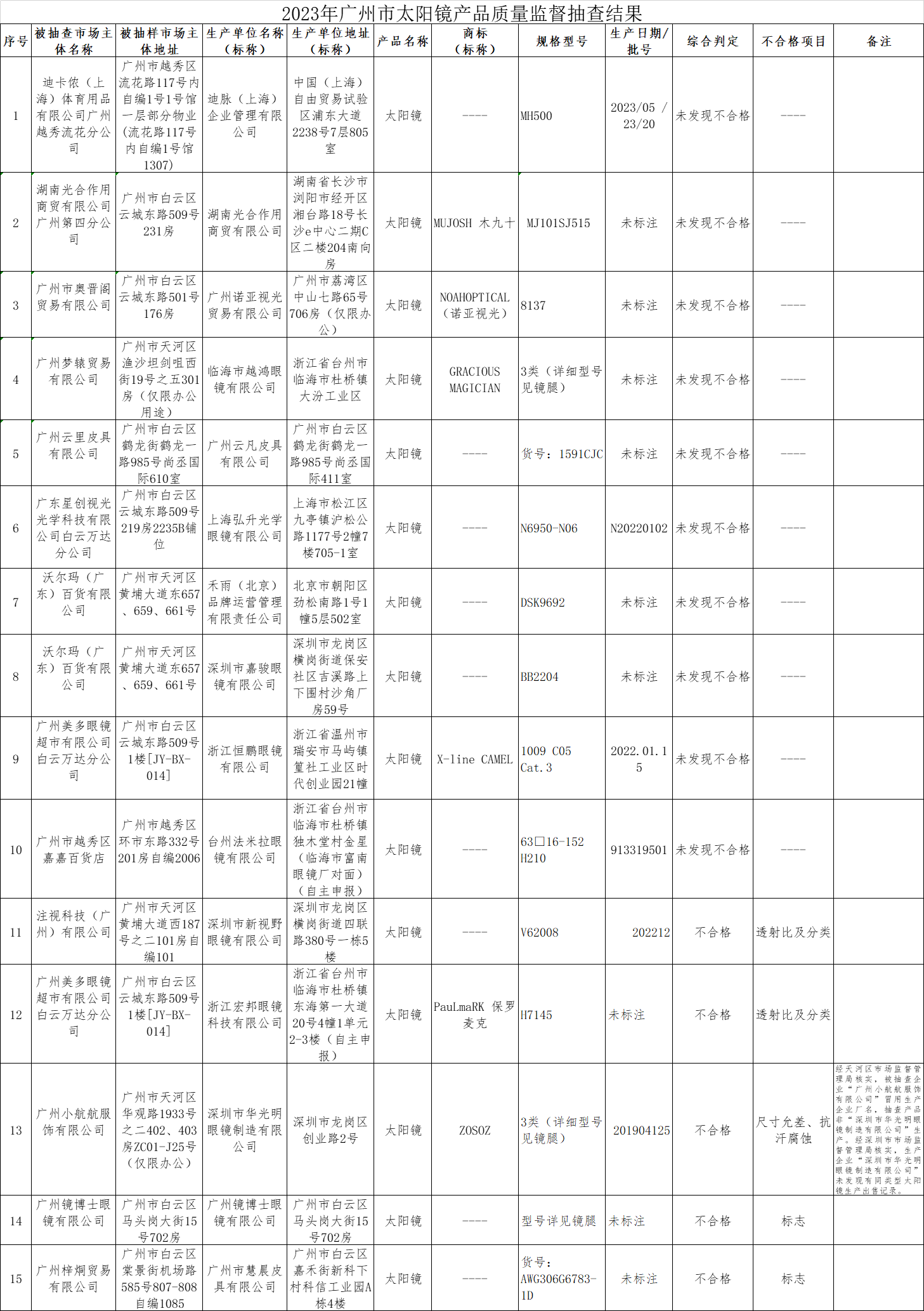 2023年第3季度,广州市市场监督管理局对太阳镜产品质量进行了监督抽查,共抽查15批次样品,经检验,有5批次产品不符合标准要求。