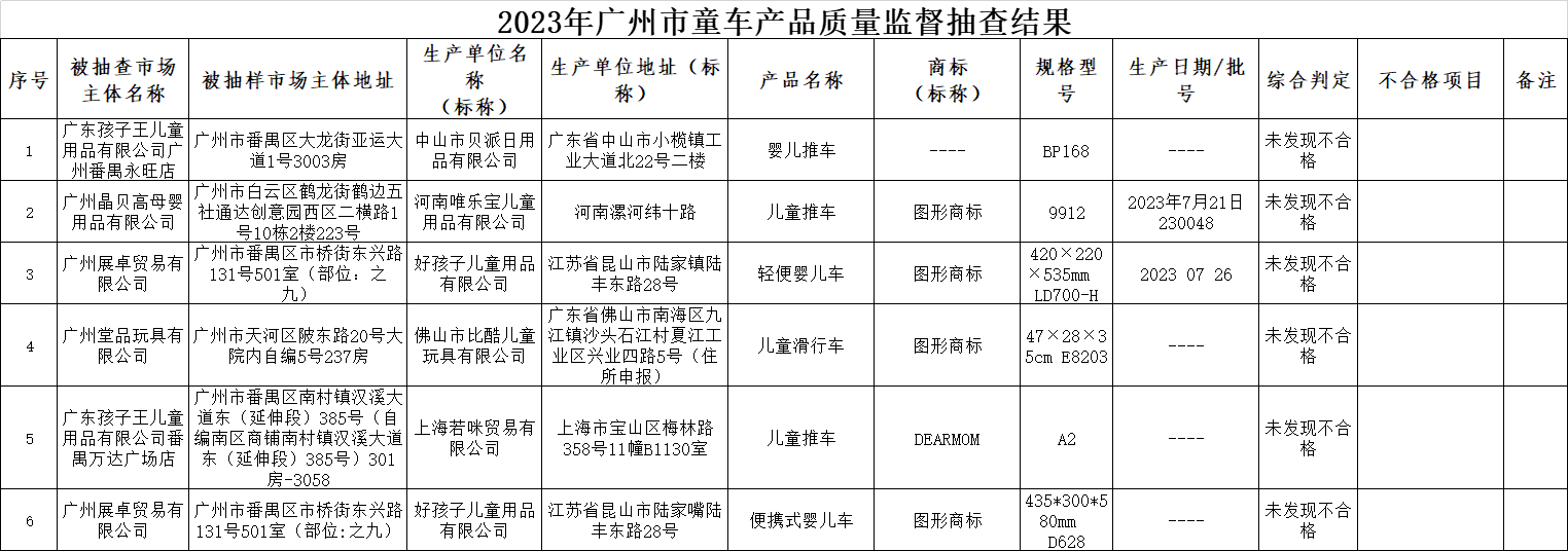 2023年第3季度,广州市市场监督管理局对童车产品质量进行了监督抽查,共抽查了6批次产品,经检验,全部产品符合标准要求。