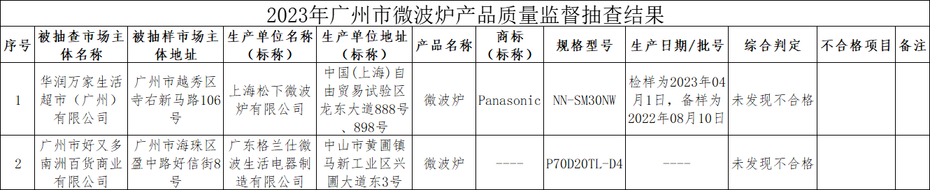 2023年第三季度,广州市市场监督管理局对微波炉产品质量进行了监督抽查,共抽查了2批次样品,经检验,未发现不合格。