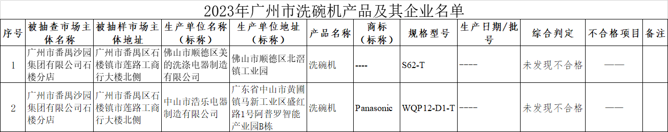 2023年第3季度,广州市市场监督管理局洗碗机产品质量进行了监督抽查,共抽查了2批次样品,经检验,本次监督抽查未发现不合格。