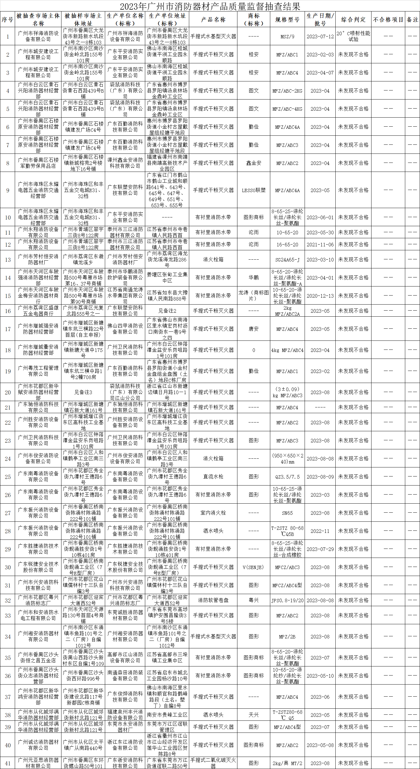 2023年,广州市市场监督管理局对消防器材产品质量进行了监督抽查,共抽查了41批次样品,经检验,发现不合格的1批次。