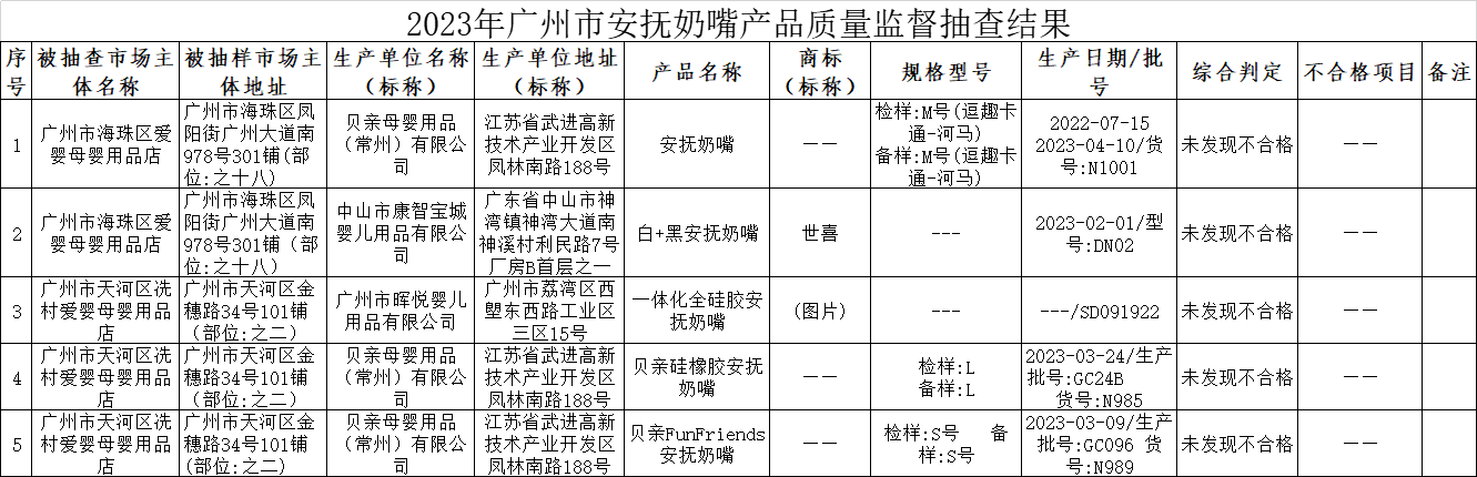 2023年第三季度,广州市市场监督管理局对安抚奶嘴产品质量进行了监督抽查,共抽查了5批次样品,经检验,全部产品符合标准要求。