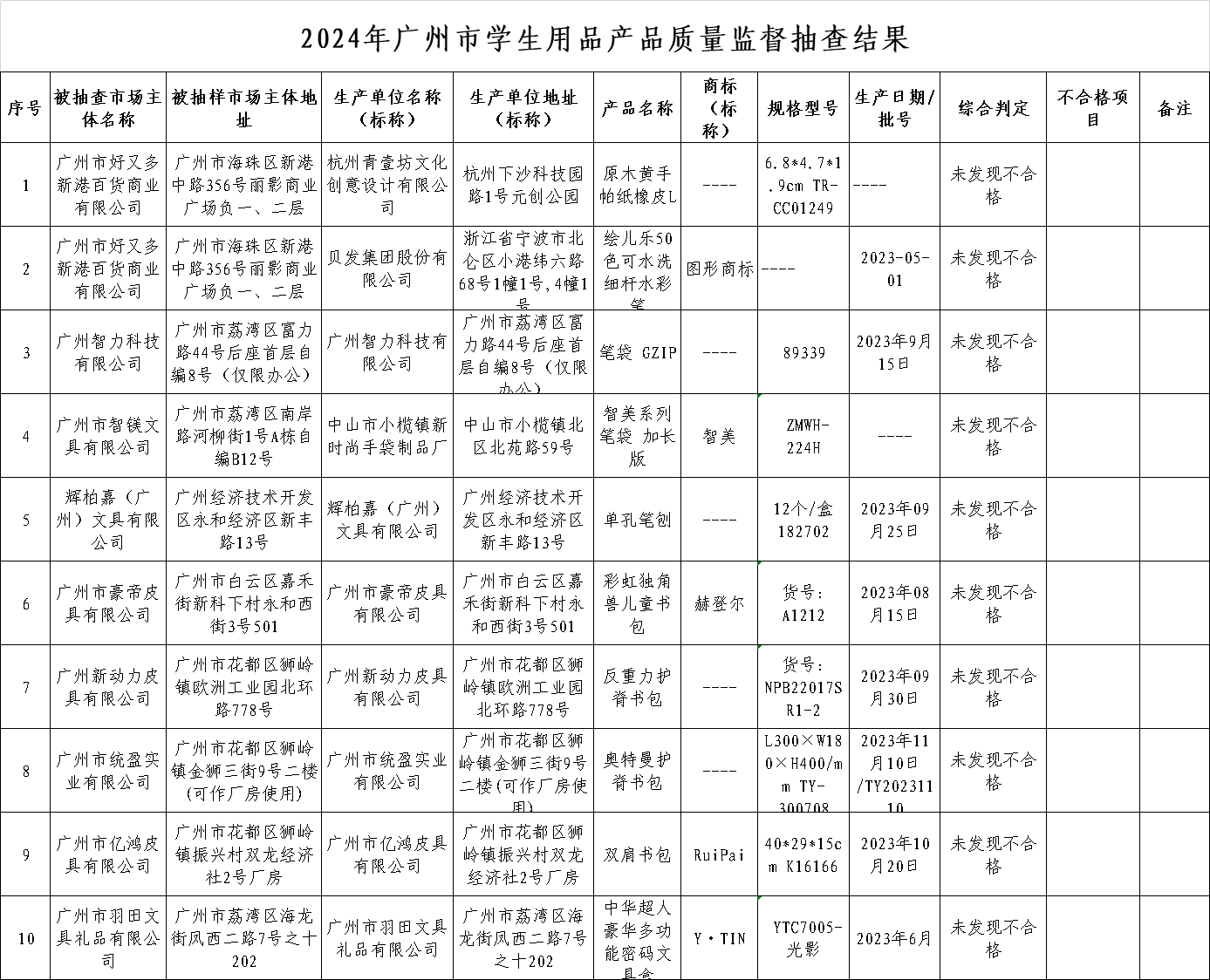 2024年第1季度,广州市市场监督管理局对学生用品产品质量进行了专项监督抽查,共抽查了10批次样品,经检验,全部产品符合标准要求。