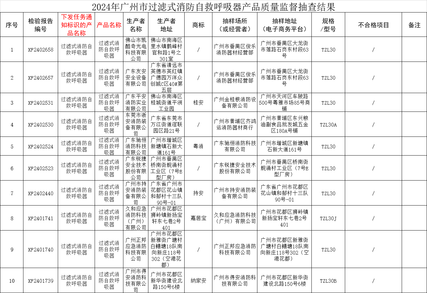2024年第二季度,广州市市场监督管理局对过滤式消防自救呼吸器产品质量进行了监督抽查,共抽查了10批次样品,经检验,未发现不合格。