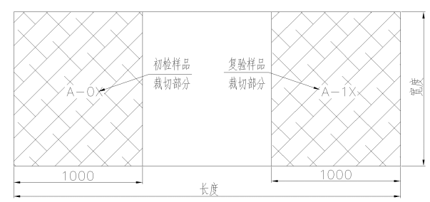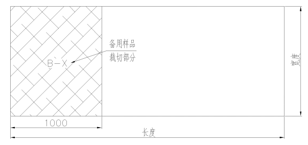 抽样样品应为同一型号规格、同一批次的产品。优先按以下原则抽取:厚度为9.5mm、12mm、18mm、21mm、25mm中任一规格和种类的纸面石膏板。从同一规格、型号的产品中随机抽取10张,5张作为检验样品,5张作为备用样品。检验样品的5张纸面石膏板按图1所示进行裁切,同一张板上截取的2块样品分别编号,一块标记为A—0X,作为初检样品;一块标记为A—1X,作为复验样品。备用样品按图2所示进行裁切,标记为B—X,X代表1~5个数字。