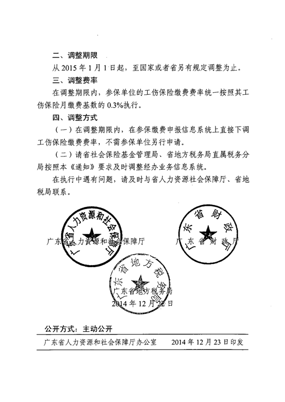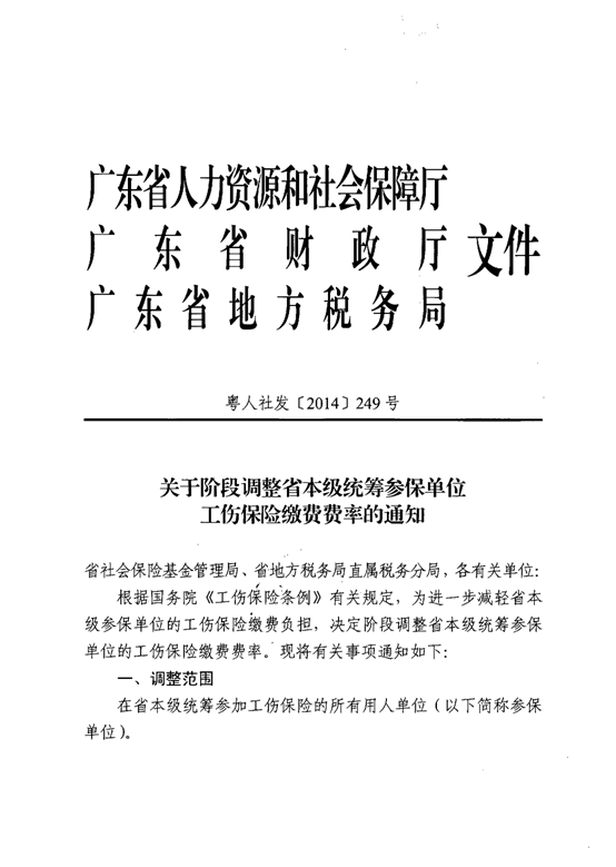 关于阶段调整省本级统筹参保单位工伤保险缴费费率的通知----粤人社发〔2014〕249号