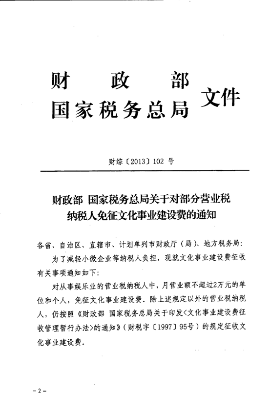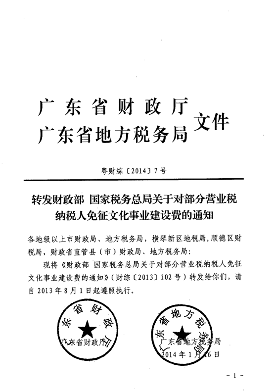 转发财政部 国家税务总局关于对部分营业税纳税人免征文化事业建设费的通知----粤财综〔2014〕7号