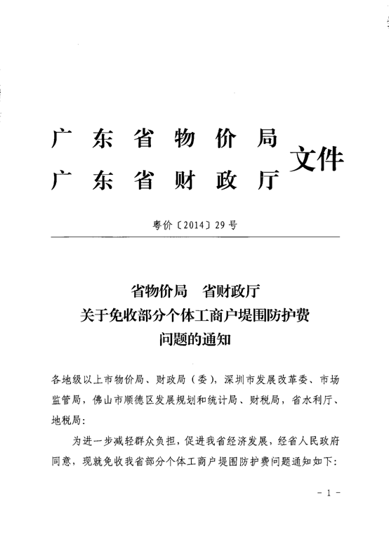 省物价局 省财政厅关于免收个体工商户堤围防护费问题的通知----粤价〔2014〕29号