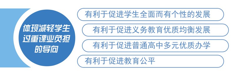 “一个导向+四个有利于”:体现减轻学生过重课业负担的导向;有利于促进学生全面而有个性的发展;有利于促进义务教育优质均衡发展;有利于促进普通高中多元优质办学;有利于促进教育公平。