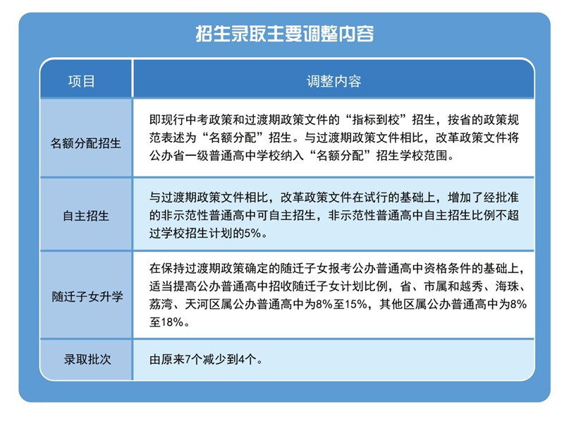《广州市教育局关于2019年至2020年广州市高中阶段学校考试招生的工作意见》《广州市教育局关于2019年至2020年示范性普通高中学校部分招生指标直接分配到初中学校的实施办法》《广州市教育局关于2019年至2020年来穗人员随迁子女参加高中阶段学校考试招生工作的实施方案》,以及《广州市教育局关于进一步深化高中阶段学校考试招生制度改革的实施意见》等4份文件,现已出台。对于相关政策,听听专家、老师怎么说?