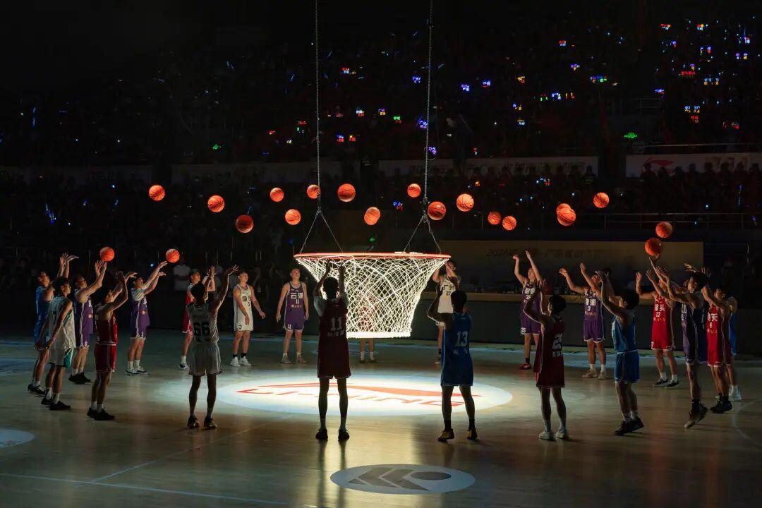 在庄重的运动员、裁判员代表宣誓后迎来“耀光”篇。在全场“5、4、3、2、1”的倒数声中,21位地市特色代表投篮至发光篮球框,“粤BA”正式开幕。
