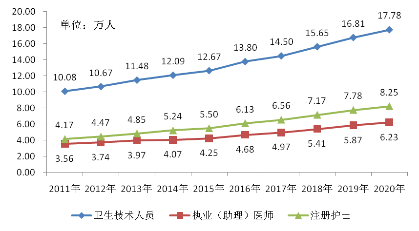 截止2020年底,全市医疗卫生机构在岗职工21.46万人,其中:卫生技术人员17.78万人、乡村医生和卫生员0.05万人、管理人员0.96万人、工勤技能人员1.90万人、其他技术人员0.76万人。卫生技术人员中,执业(助理)医师6.23万人,注册护士8.25万人,医护比1:1.32。与上年相比,在岗职工增加1.19万人,其中:执业(助理)医师增加0.37万人,注册护士增加0.47万人。