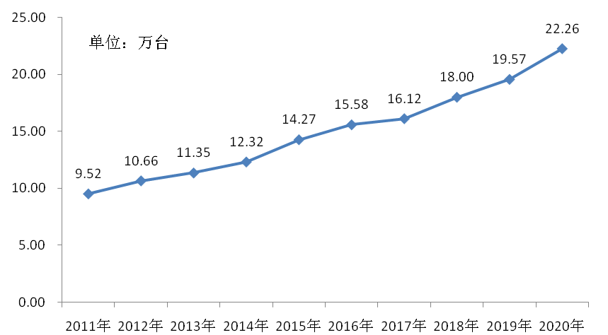 截止2020年底,全市医疗卫生机构拥有万元以上设备台数达22.26万台,比上年增加2.70万台,增长13.78%,其中:10-49万设备4.51万台、50-99万设备0.74万台、100万及以上设备0.73万台。