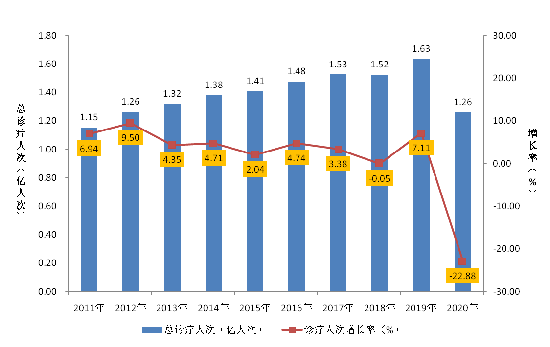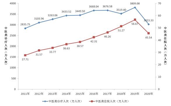 图13 2011-2020年中医类诊疗和住院情况