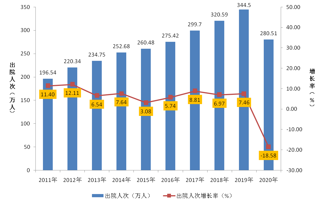 图6 2011-2020年全市医疗机构住院服务量