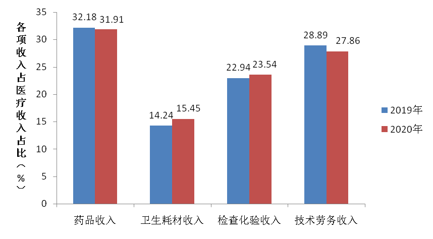 2020年,全市医院医疗收入920.24亿元,其中公立医院医疗收入847.02亿元,与上年相比,公立医院医疗收入下降7.84%,其中药品收入占31.91%、卫生耗材收入占15.45%、检查化验收入占23.54%、技术劳务(护理、手术、治疗等)收入占27.86%。与2019年相比,药占比下降0.27个百分点,卫生耗材占比提高1.21个百分点,检查化验占比提高0.60个百分点,技术性劳务占比下降1.03个百分点。