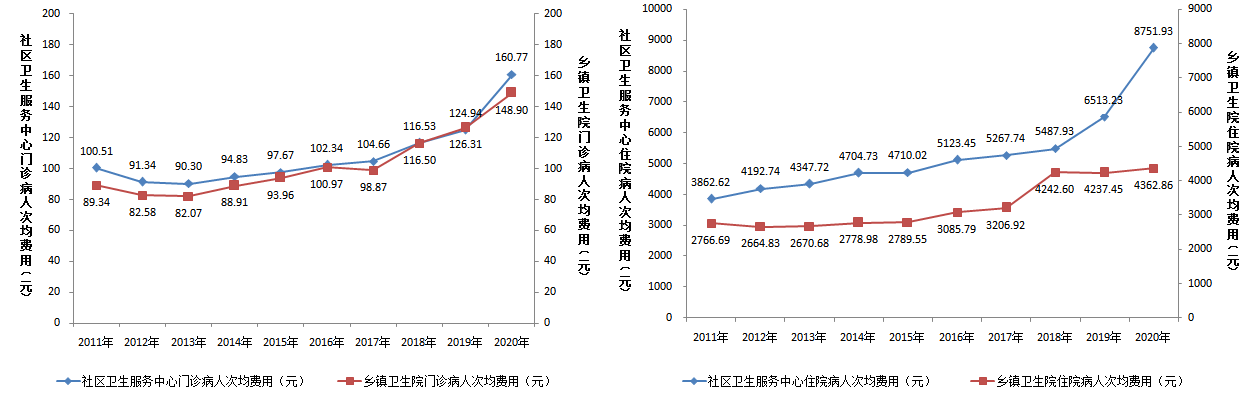 2020年,社区卫生服务中心次均门诊、住院费用分别为160.77元、8751.93元,分别较上年增长28.68%、34.37%。乡镇卫生院次均门诊、住院费用分别为148.90元、4362.86元,与上年相比,乡镇卫生院次均门诊费用增长17.88%,次均住院费用增长2.96%。
